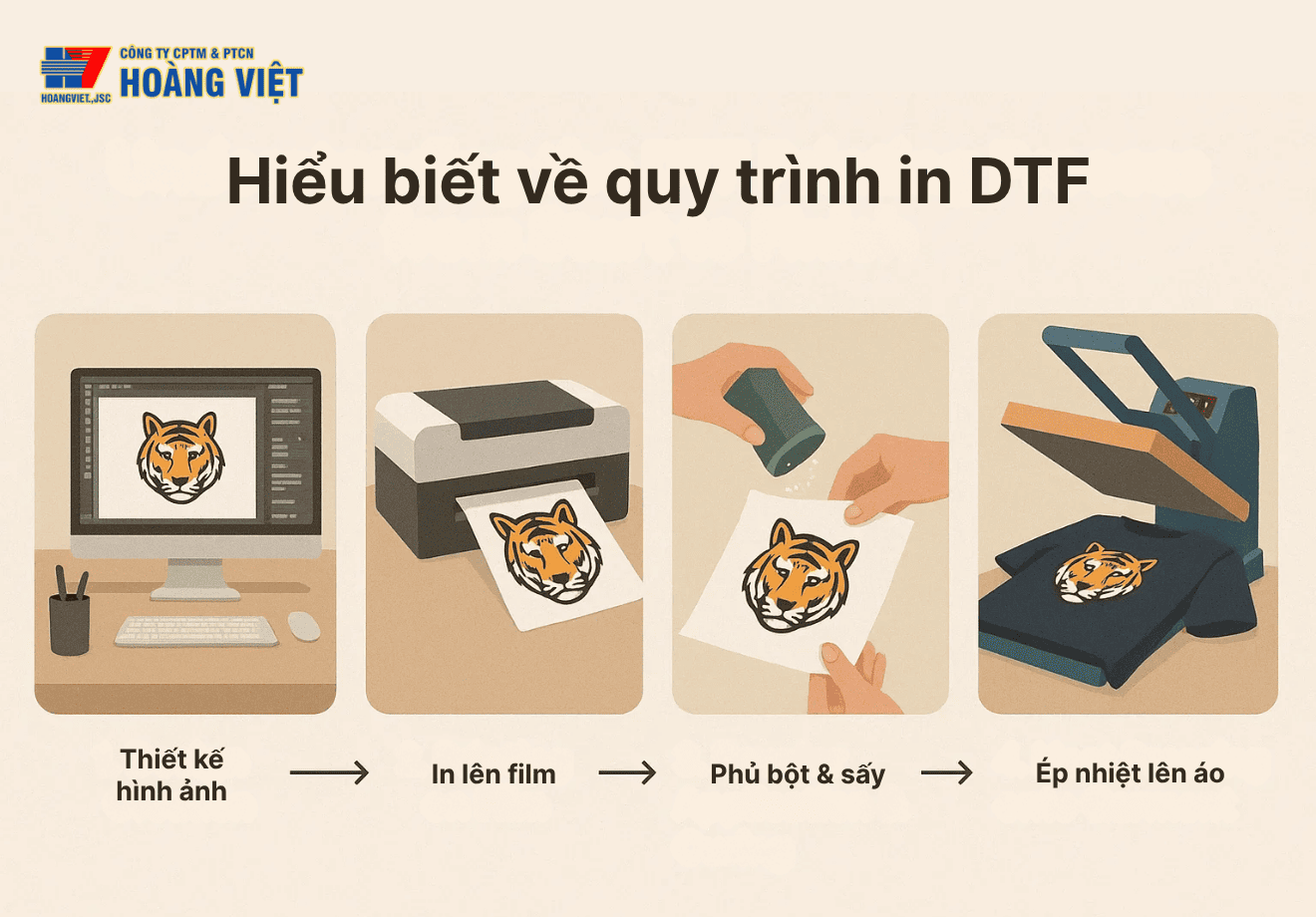 Khác với các phương pháp truyền thống, công nghệ này không yêu cầu in trực tiếp lên vải mà thông qua film trung gian. Điều này giúp hình in sắc nét, màu sắc chuẩn và có thể áp dụng trên nhiều loại vải, kể cả vải tối màu.