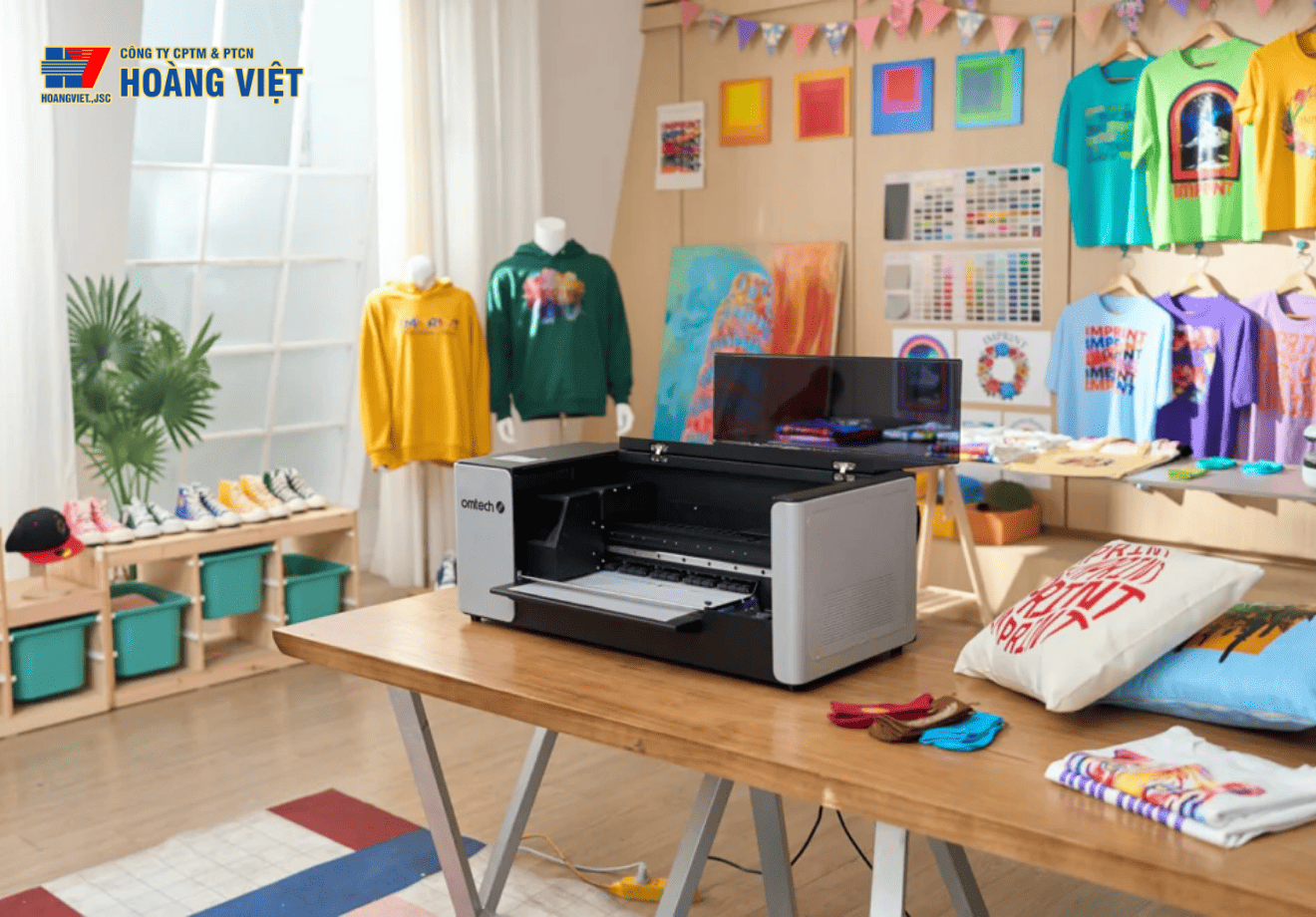 Trước hết là khả năng in trên nhiều loại vải khác nhau, bao gồm cả vải sáng và tối màu. Điều này giúp mở rộng danh mục sản phẩm mà không cần đầu tư thêm công nghệ khác.