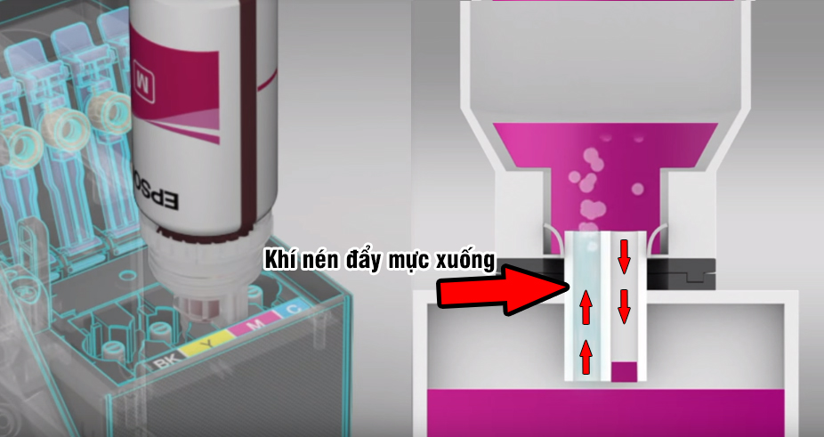 - Đổ mực rất dễ dàng với chức năng tự bơm mực. bạn chỉ cần mở lắp và cắm bình mực vào là mực tự động được đẩy xuống.